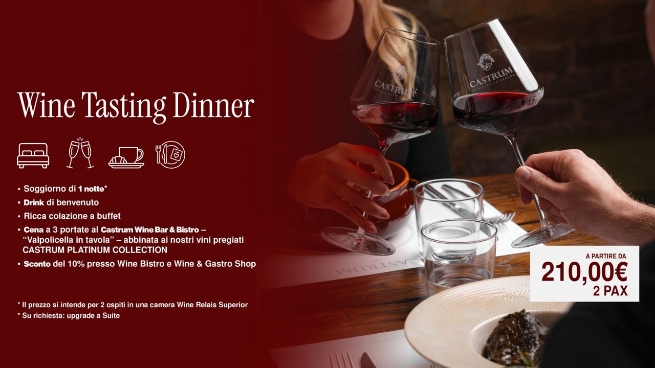 Il Wine Relais “Castrum” si trova sulla sommità più alta della collina centrale della Valpolicella Classica, nel borgo medievale di Castelrotto. Da qui puoi abbracciare tutta la vallata con uno sguardo ed è subito bellezza.